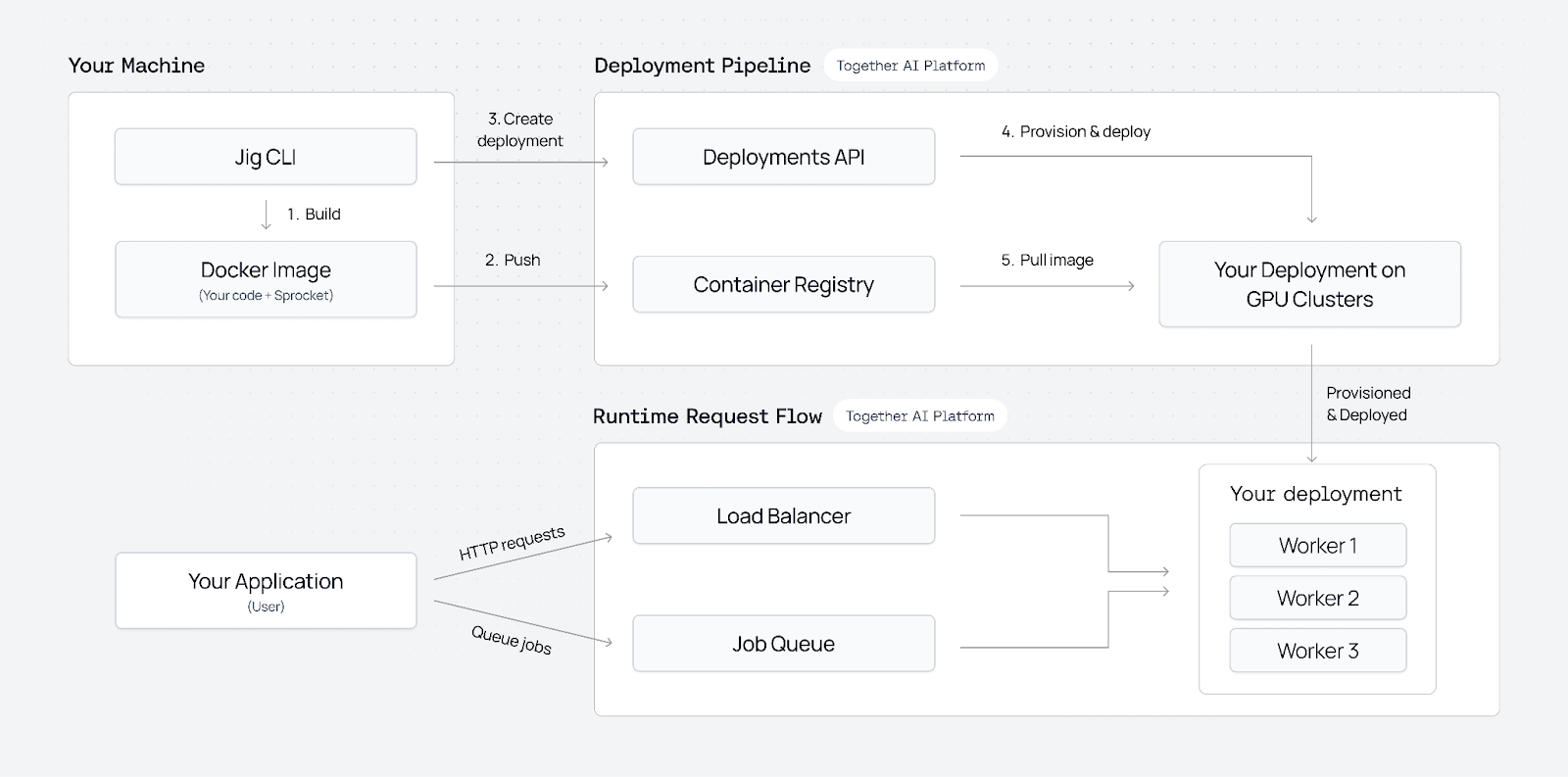 Dedicated Container Inference is built on a container-based deployment framework where jobs and queues are first-class concepts. Instead of forcing inference into a single request-response shape, we treat your container as the unit of execution and manage everything around it.