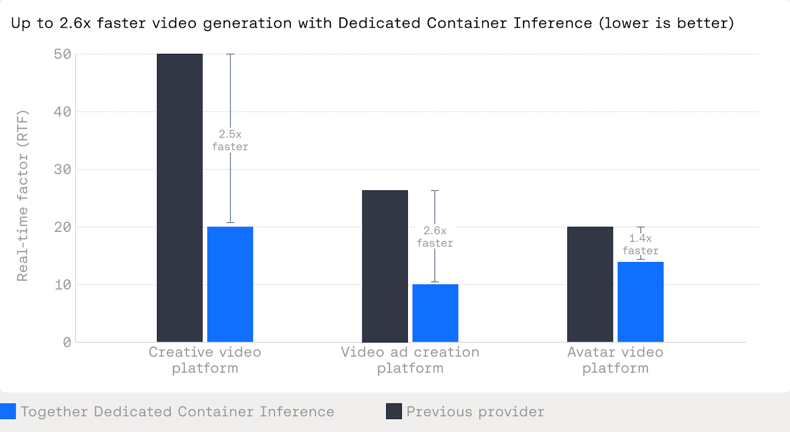 Dedicated Container Inference lets teams deploy custom generative media models — like video generation, avatar synthesis, and image processing — with production-grade orchestration they don't have to build themselves. Bring your Docker container; Together handles autoscaling, queuing, traffic isolation, and monitoring. For teams already training on Together's GPU Cloud, going from training to production requires zero artifact transfers. Customers like Creatify and Hedra have seen 1.4x–2.6x inference speedups, driven by both the platform architecture and hands-on optimization from Together's research team.