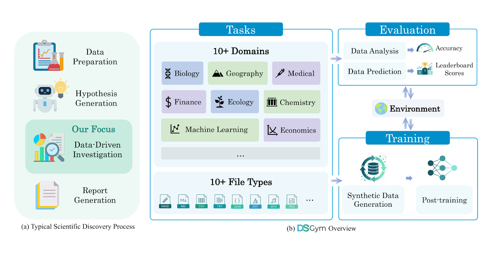 To support task execution and data generation, DSGym provides a data generation pipeline to execute queries and generating trajectories, turning the framework into a data factory that can effectively train models.