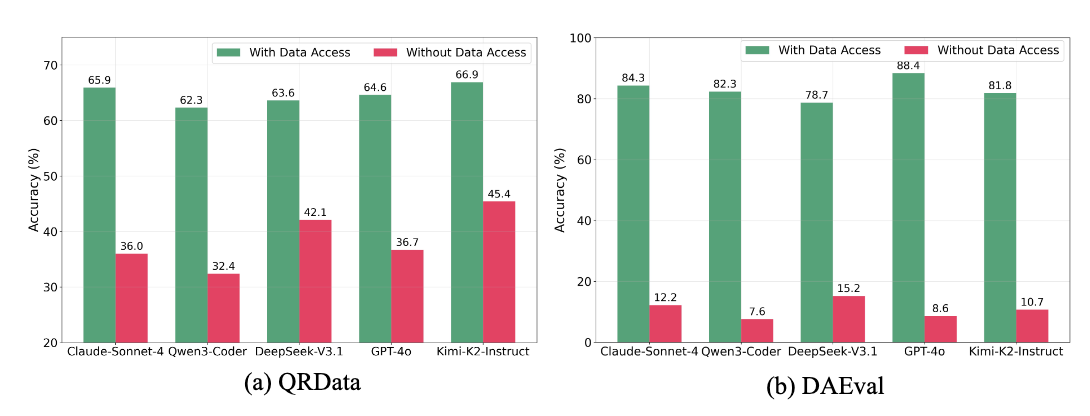 Thus, we made sure to flag and exclude these examples that are likely in the training sets of the models. DSGym applies quality filtering and prompt-only shortcut filtering to remove such tasks, producing refined datasets: DAEval-Verified, QRData-Verified, DABStep, and MLEBench-Lite.