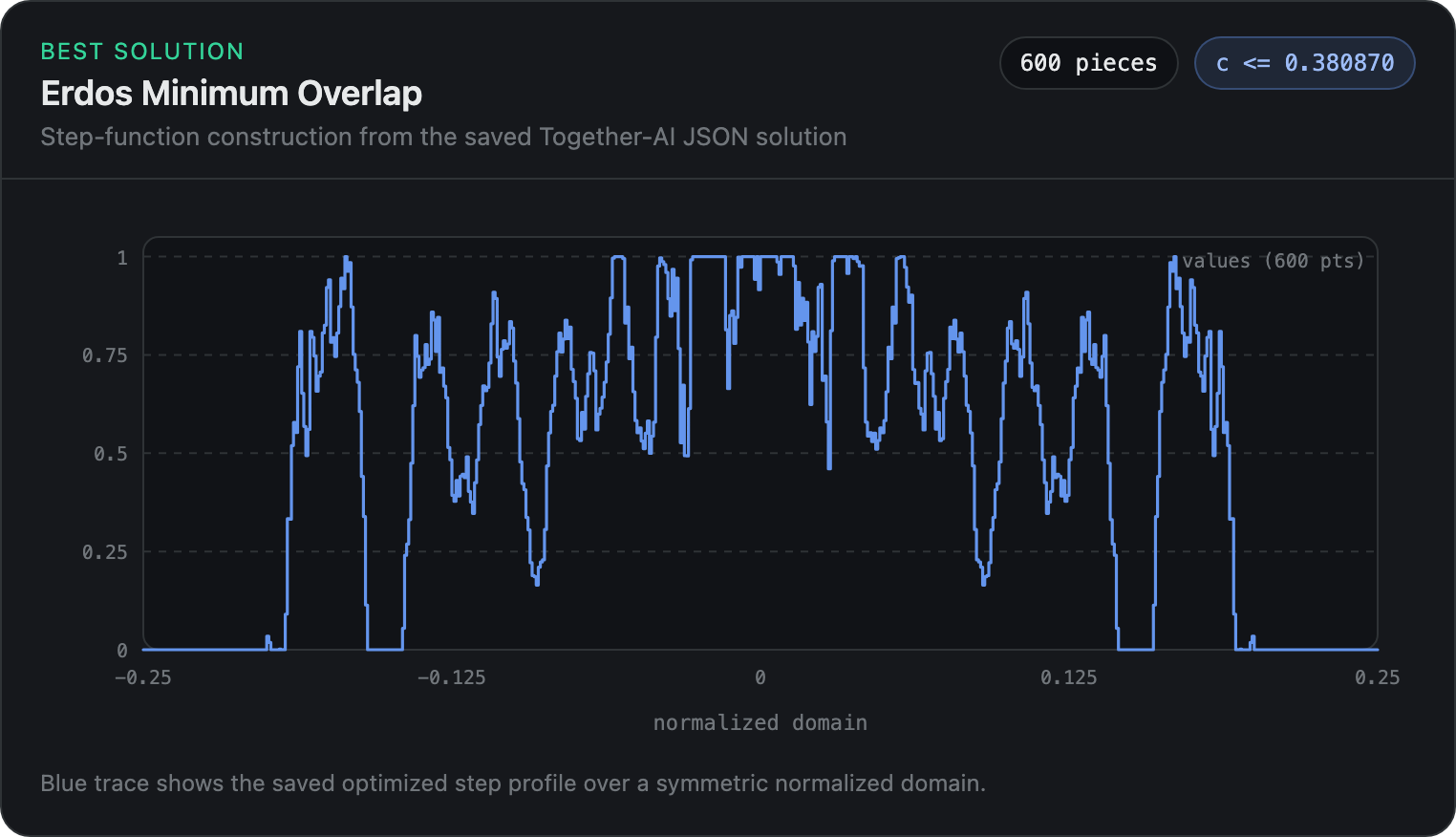 The plot shows the optimized step-function profile from our best solution to the minimum overlap problem: each horizontal segment is the value of the construction on a small interval, and together they visualize the shape that achieves a near-extremal overlap bound.