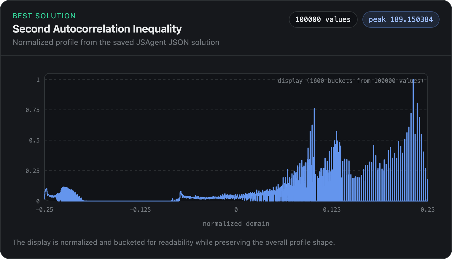 The plot shows the normalized profile of the candidate function for the second autocorrelation inequality.