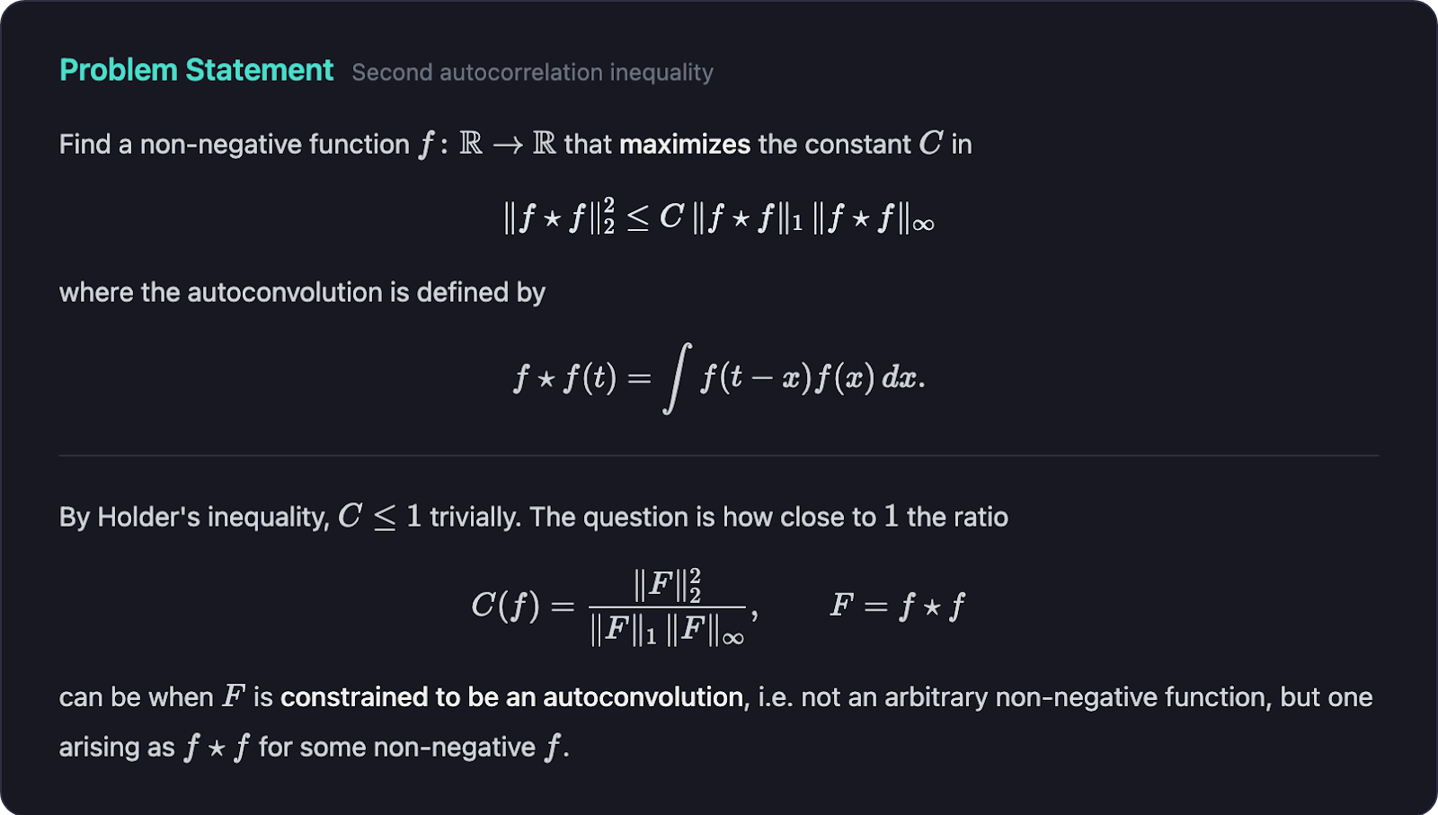 The task is to search over non-negative discretized functions and maximize the ratio appearing in the inequality by shaping the function so that its autoconvolution has as much L2 mass as possible relative to its L1 and L∞ norms. In practice, agents submit an array of non-negative values, the verifier computes the autoconvolution, and the resulting ratio is the score. Higher is better.