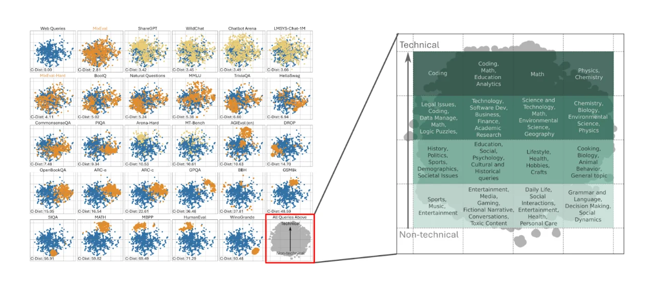 Large language models are general-purpose systems that people use for everything from entertainment to work and everything in between, so their evaluation should reflect this breadth. A benchmark that only tests mathematical reasoning might miss crucial limitations in common sense reasoning or creative writing. The MixEval framework illustrates this principle well, showing how different domains — from STEM fields to social dynamics — occupy distinct regions in the evaluation space.