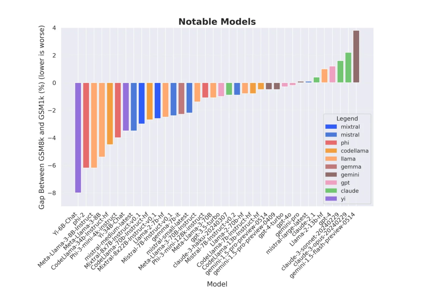 The GSM8K vs. GSM1K comparison illustrates this problem perfectly. GSM8K is a widely-used benchmark of mathematical word problems, while GSM1K contains similar problems that are guaranteed to be novel. When researchers compared model performance on both benchmarks, they found that many models scored significantly lower on GSM1K, suggesting that high GSM8K scores might partially reflect memorization — rather than genuine mathematical reasoning ability.