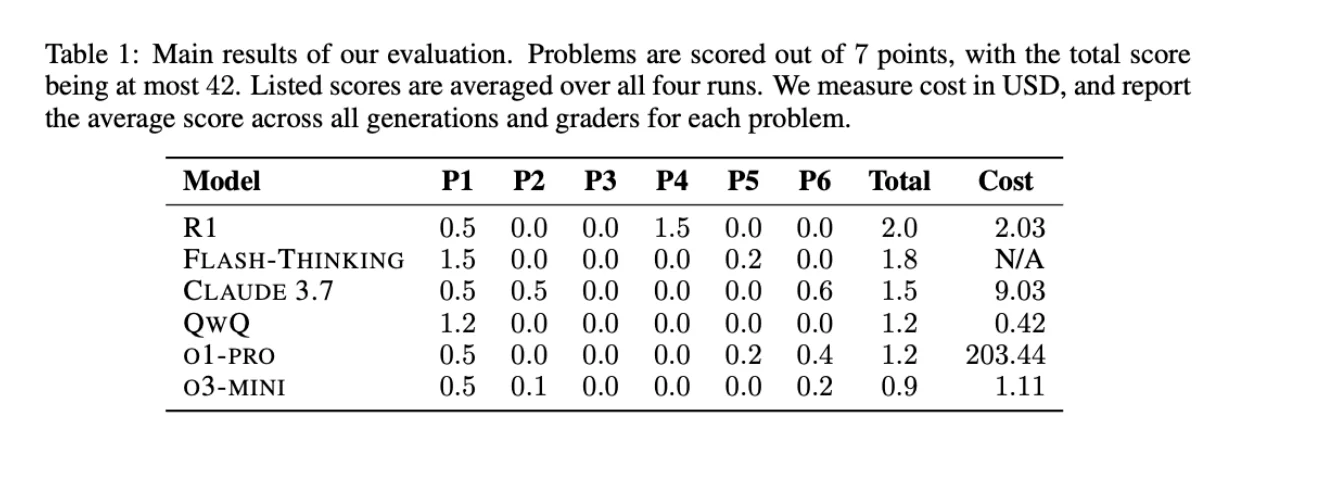 This problem is even further highlighted when looking at data contamination in MATH benchmarks. When SoTA models were evaluated on the U.S. Math Olympiad (USAMO 2025) hours after it was released (to eliminate the possibility of data contamination at all) even the best reasoning models at the time performed horribly at below 5%!
