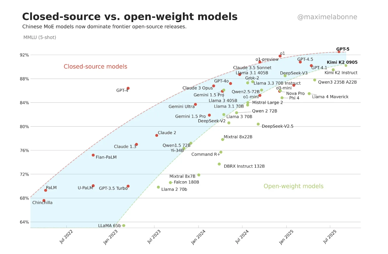 Benchmarks also help us track broader trends in AI capabilities. Take the MMLU benchmark, which tests knowledge across 57 college-level subjects. By plotting MMLU performance over time, we can see that last year we passed this fascinating inflection point: open-source models are now on par in performance — or in some cases better than — closed-source systems, marking a significant shift in the AI landscape.