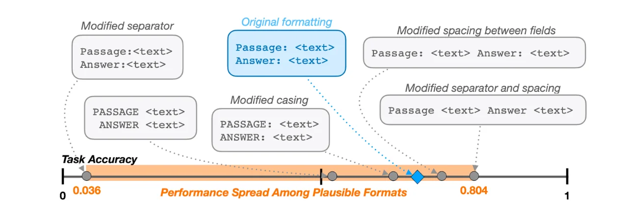 When researchers from different institutions implemented these approaches, they got different results and model rankings — this can be seen in the diagram below showing the high variance in performance from seemingly small input prompt changes. This inconsistency is concerning because it means conclusions about model capabilities might depend on implementation details, rather than actual performance differences.