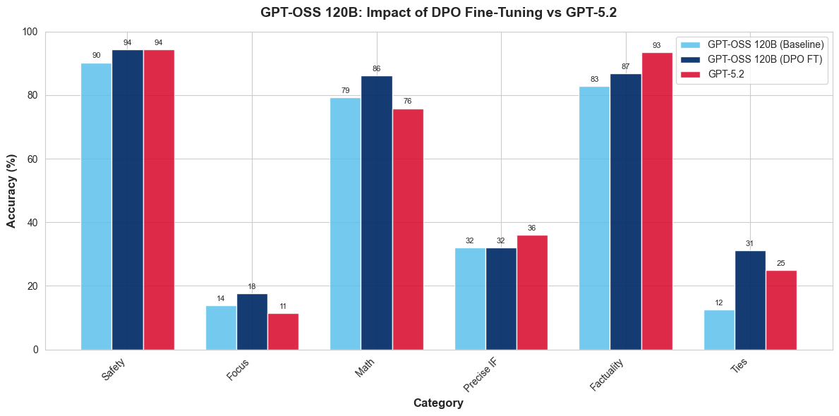 A deep dive into using preference optimization to train open-source models that beat GPT 5.2. We show that fine-tuned open-source models like gpt-oss 120b and Qwen 3 235B Instruct more often agree with human preference labels on a held-out evaluation set. We evaluate using Reward Bench 2 which measures alignment with human judgment, not absolute correctness or ground-truth quality. The table below is a quick sneak preview of the results we got, if you’d rather just see the code please feel free to jump into the cookbook!