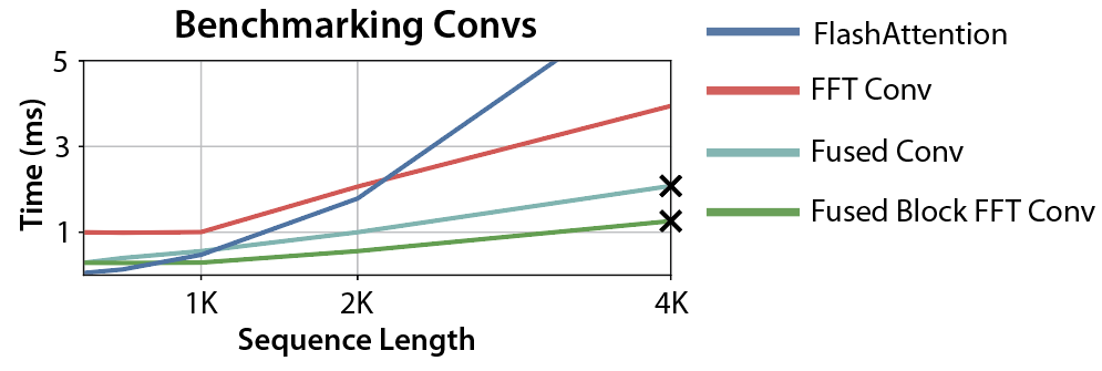 Wait… the asymptotic performance looks good, but the FFT convolution is still slower than attention at sequence lengths <2K (which is where most models are trained). Can we make that part faster?