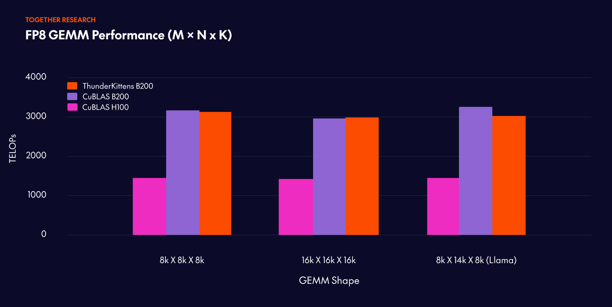 "We had experience adapting kernels to new hardware, and we knew it would take time," Dan says. "For example, FlashAttention-3 came out a year after general Hopper availability. We wanted to build tools to make it easier to quickly build kernels for the new hardware generation, and ThunderKittens was the answer."