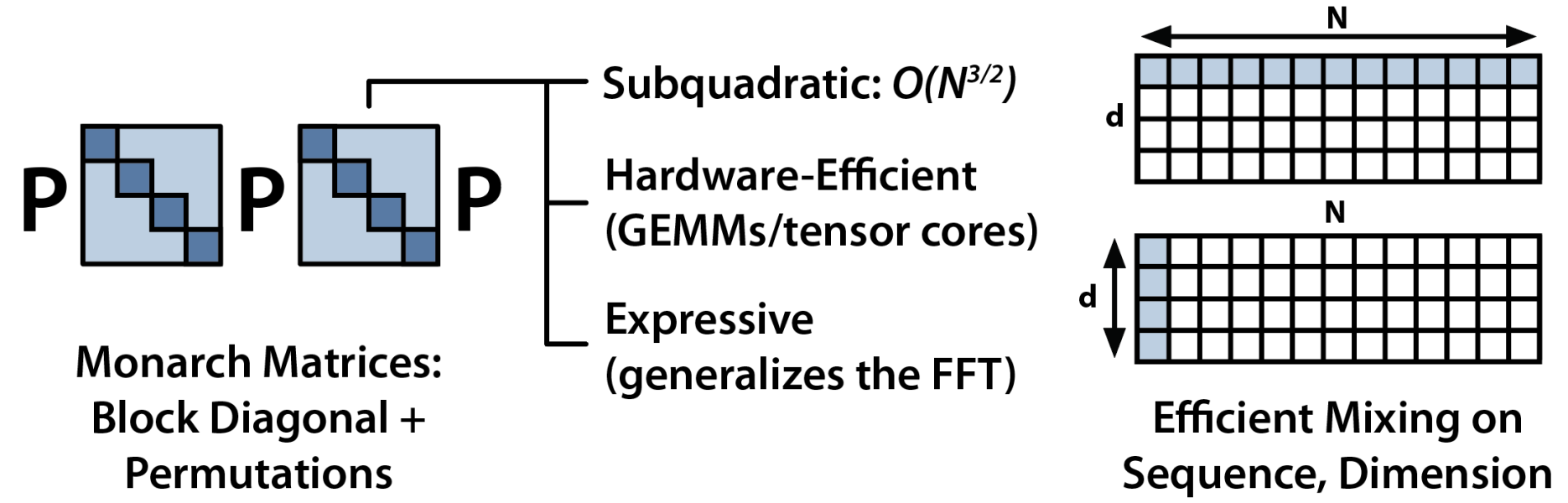 Monarch matrices are a sub-quadratic primitive (you can compute them in $O(N^{3/2})$) that are also hardware-efficient and expressive. The block-diagonal matrices map onto tensor cores, and the permutations generalize the Fast Fourier Transform. As a result, Monarch matrices can efficiently capture all sorts of structured linear transforms: