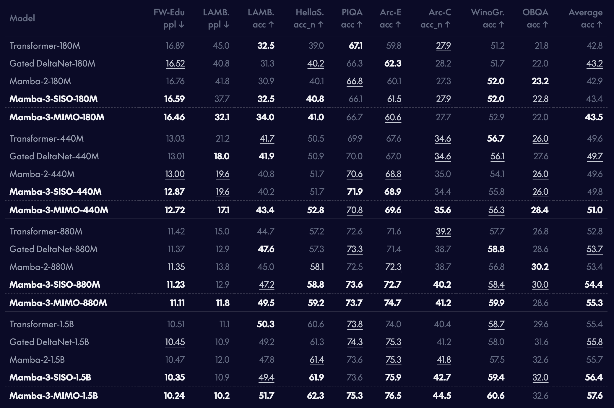 We find that our new Mamba-3 model outperforms the prior Mamba-2 model and strong linear attention alternatives, such as GDN, on language modeling across various pretrained model scales. Mamba-3-SISO is directly comparable to prior linear models; for example, it matches Mamba-2 exactly in architecture shapes (model dimensions, state size, etc.) and has comparable training time. Our MIMO variant of Mamba-3 further boosts accuracy on our downstream tasks by more than 1 percentage point over the regular Mamba-3 at the 1B scale, with the caveat that MIMO requires longer training times but not longer decoding latencies!