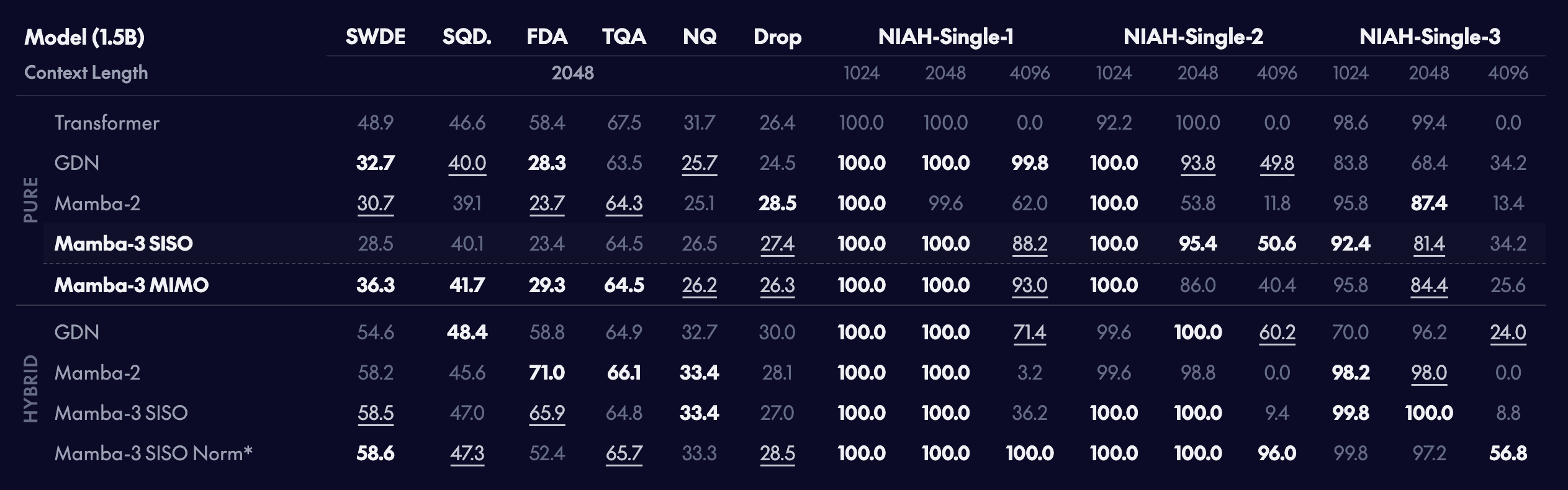 Norms. We added in QKNormor "BCNorm" in SSM terminology, which empirically stabilizes the training of Mamba-3 models. The addition of this norm brings Mamba-3 in line with contemporary Transformer and Gated DeltaNet (GDN) models. With QKNorm, the RMSNorm from Mamba-2 becomes optional. However, we empirically find that it may still be worth keeping in hybrid models due to helping length extrapolation capabilities. More on this later.