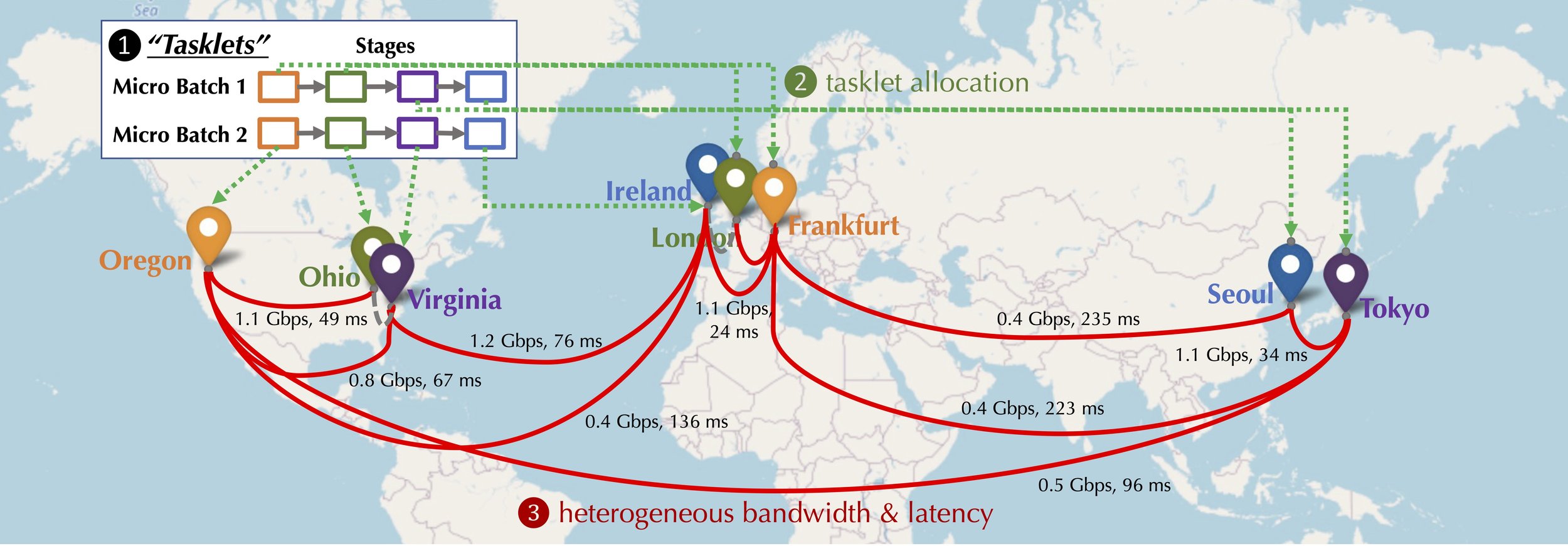 These two types of parallelism combined lead to a set of computation tasks. Formally, we define a tasklet \(t_{i,j}\) as the forward and backward computation for a particular stage \(j\) with a micro-batch \(i\) of training data in a training iteration. Given the heterogeneity of the underlying network (e.g., Oregon ↔ Ohio can be much faster than Frankfurt ↔ Seoul), one important problem in decentralized training is to assign tasklets to devices as to maximize the training throughput.
