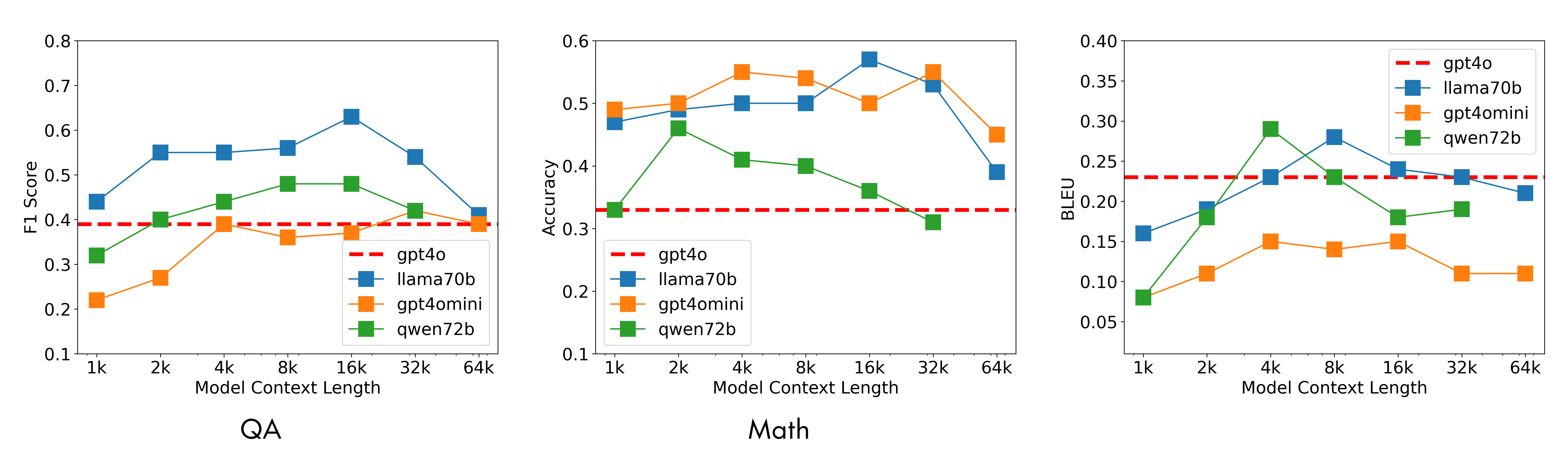 We tested this framework implementation across diverse tasks (retrieval, QA, summarization, etc.). As shown below, a weaker model using this framework (e.g., Llama-3-70B or Qwen-72B) outperforms GPT-4o reading the whole text in one shot. While the single-shot model (red dashed line) degrades as context length increases, the D&C models maintain high performance.