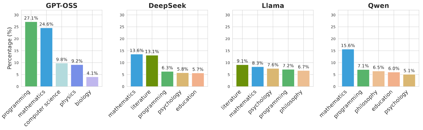 More surprisingly, shown in Figure 1(b), different model families gravitate toward different parts of the semantic space—even when given the same minimal prompts. GPT-OSS overwhelmingly defaults to programming (27.1%) and mathematics (24.6%). More than half of a model family’s output concentrates in these two domains! Llama produces far more literary and narrative text (9.1%), with less emphasis on technical domains (See Figures 2). DeepSeek often generates religious content at a substantially higher rate than other families. Qwen frequently outputs multiple-choice exam questions, complete with answer options.