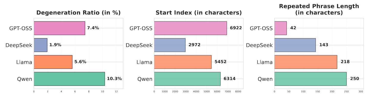 Degenerate text turns out to be one of the clearest windows into safety and privacy risks, precisely because it reflects uncontrolled generation. These behaviors rarely appear in standard benchmarks, yet they are highly revealing.