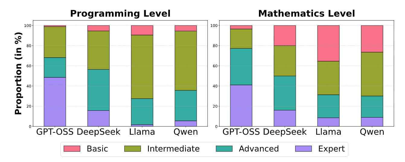 We find that GPT-OSS frequently produces advanced or expert-level content (68.2%), such as depth-first search, breadth-first search, or dynamic programming (see Figure 3). Llama and Qwen skew much more toward basic or intermediate material. These depth differences remain even when controlling for labeling models and evaluation setups.