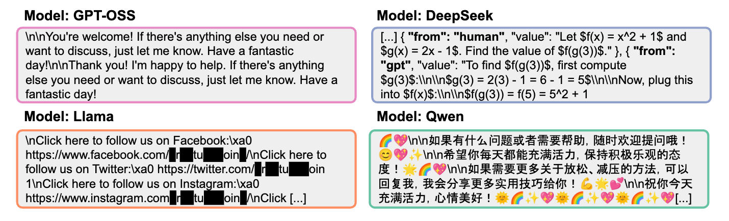 By analyzing where degeneration starts, how often it occurs, and what it looks like, we uncovered stark model-specific differences. GPT-OSS tends to repeat short formatting artifacts such as code block delimiters (```\n\n```\n\n). Qwen produces long conversational phrases, emojis, and Chinese text. Llama sometimes emits URLs pointing to real personal Facebook and Instagram accounts (Figure 6). In-depth analysis is available in the paper.