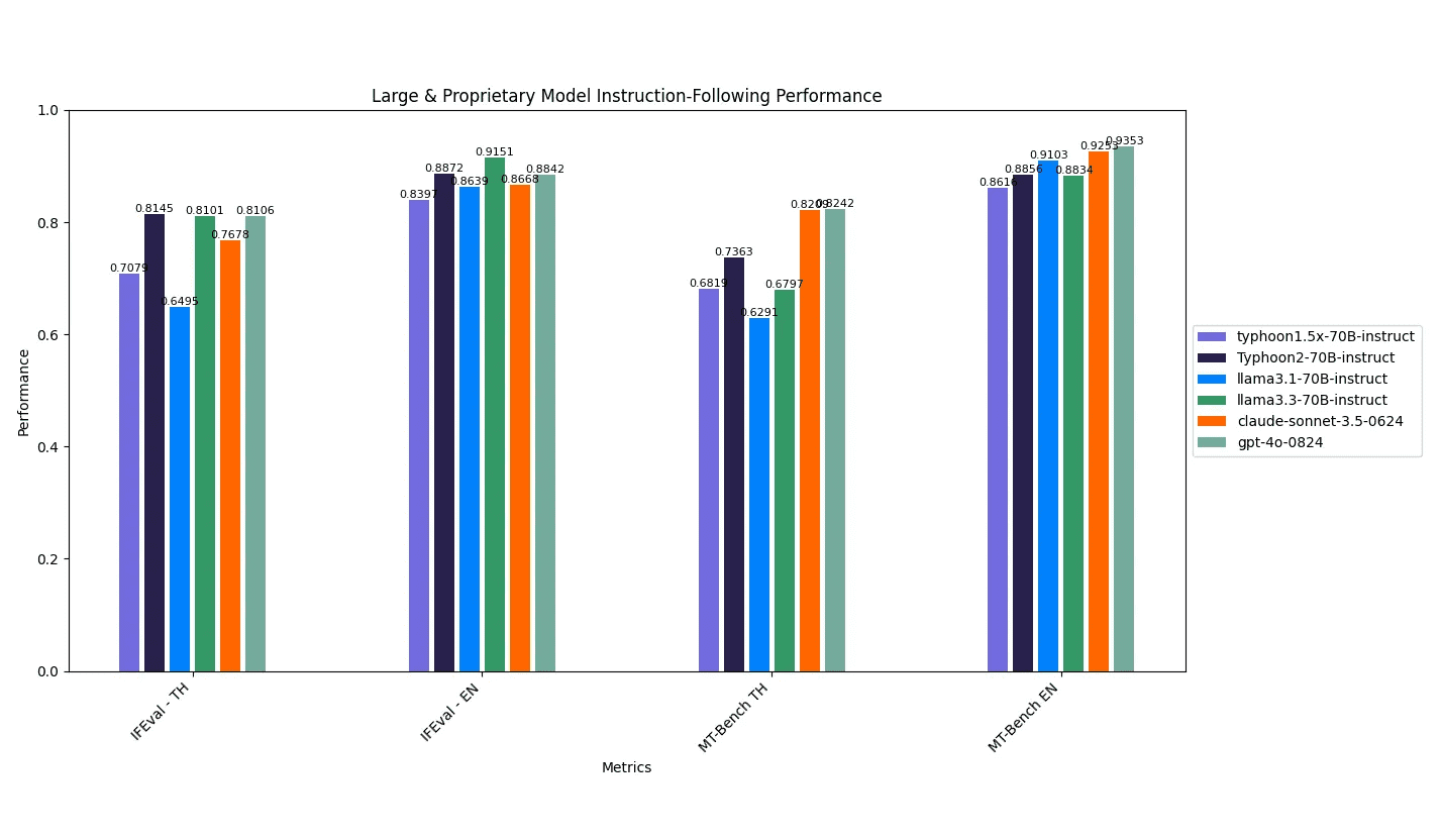 SCB 10X's larger model delivers the highest overall performance on ThaiExam and closely competes with Qwen2.5 72B on international math benchmarks. Its superior results on Thai instruction-following tasks, combined with competitive English performance, make it a compelling alternative to proprietary models like GPT-4o for multilingual use cases.